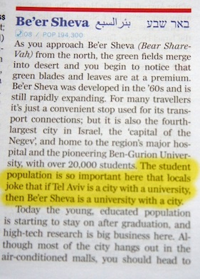 I later got my hands on the newest edition of the Lonely Planet Israel guidebook, to find that Beer Sheva’s status was slightly elevated.