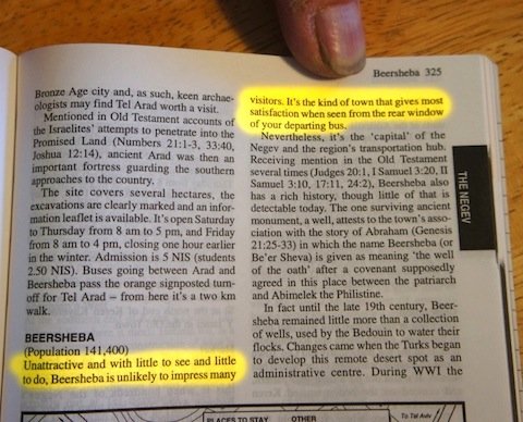 “Unattractive and with little to see and little to do, Beersheva (sic) is unlikely to impress many visitors. It’s the kind of town that gives most satisfaction when seen from the rear window of your departing bus”