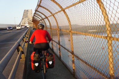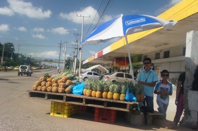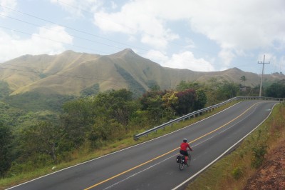 It was time to start riding for real, and the biggest challenge was getting out of Panama City. We had to ride on the highway and even though we left at 6:30am, rush hour traffic was already at its peak. Luckily the Bridge of the Americas, which runs across the Panama Canal, had a sidewalk, but it was still pretty bad… After the bridge the road at least had some shoulders and traffic eased off a bit. It was incredibly hot with almost no shade on the main road. There were some nice things though like a mother and two sons from Colombia selling pineapples and quickly peeling one for us. Or a place selling cold coconuts (pipas) at the end of a hot and sweaty uphill.