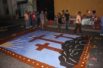 On the holiest Friday of the year we arrived to the town of Zacatecoluca (a real tongue twister). As we cycled into town we saw a group of teens working in the middle of the street to create a colourful “carpet” of Christian elements using salt. A few hours later the city was packed with people marching along the “carpets”. Later on a few dozen white robed people carried the huge casket of Jesus on a procession.