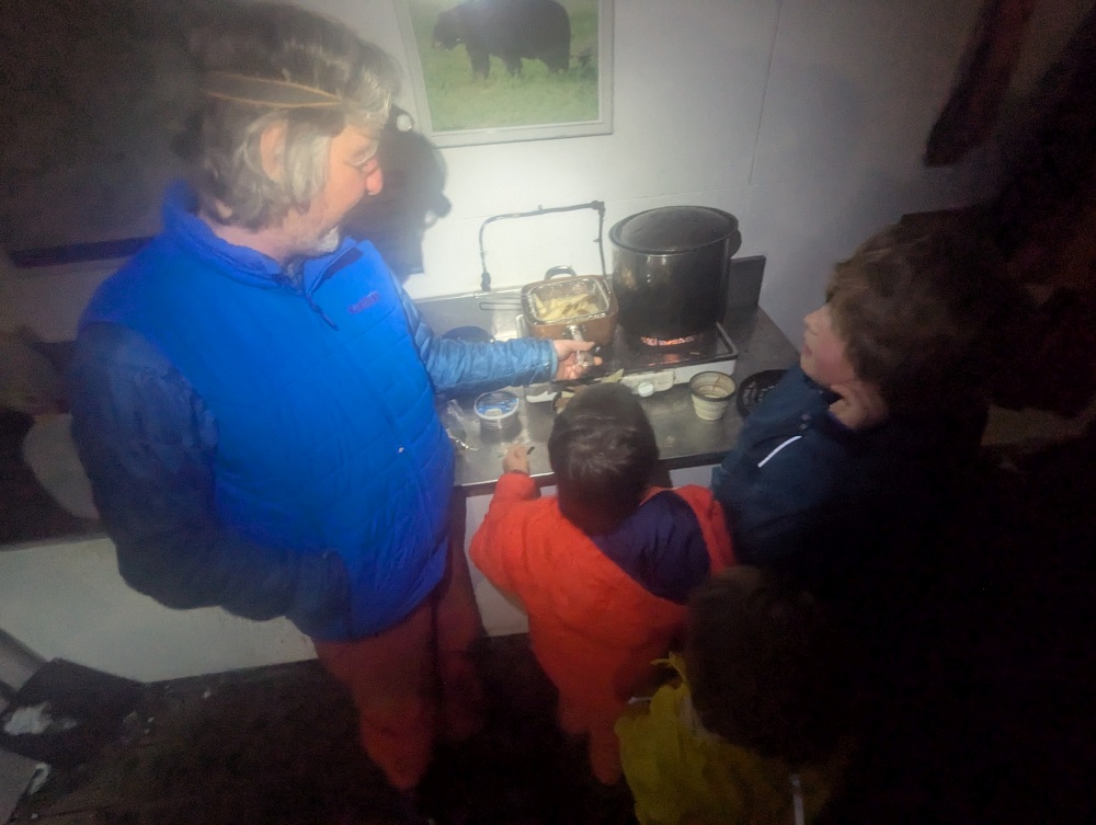 After we were done with dinner, Ross whipped up some french fries. Yep, he brought a big pot, oil, potatoes, and made french fries in the backcountry. They were delicious, and a definite highlight for the kids. At some point some of the fries fell into the yucky sink. Ross salvaged them by frying them again: “I figure, if boiling purifies water, then boiling oil has got to kill everything“. Words of wisdom… The kids said that the double fried fries were the best ones!