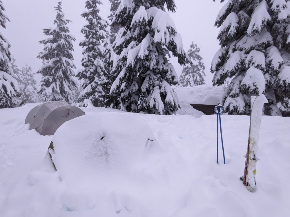 We woke up to find our tent completely covered by new snow! Neil had frozen feet and it took us a while to warm them up. We contemplated going up to the ridge for a ski, but just for a moment. The kids were very content to climb up onto the roof of the warming hut again and play there till we deemed it time to go.